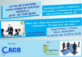 O Centro Acadêmico de Licenciatura em Computação está com inscrições abertas para o Módulo II Curso: ''Como elaborar Eventos''. O Curso será ministrado pela professora Liz Rodrigues e...